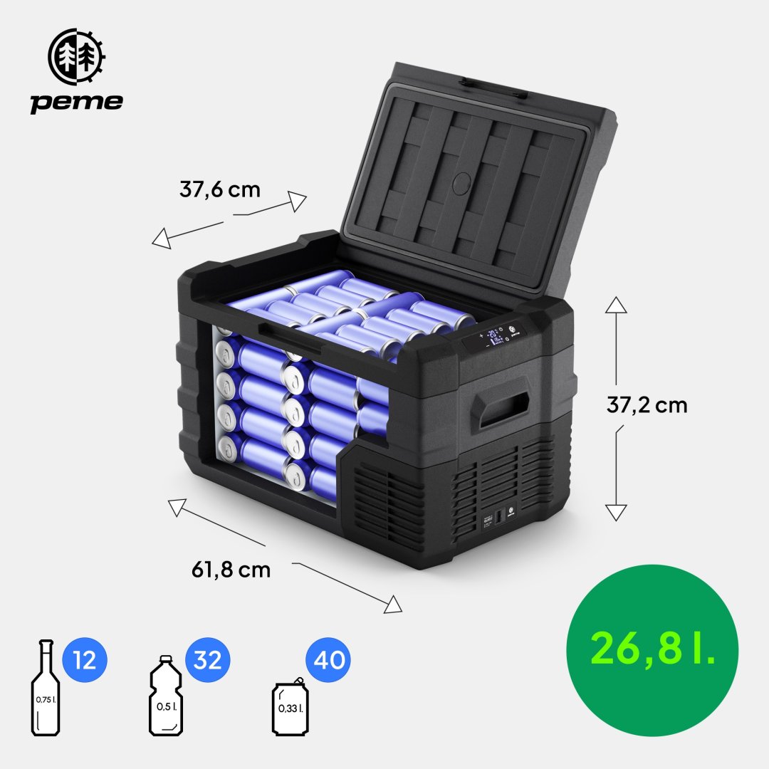 Автомобільний холодильник має об'єм 26,8 л, чого вистачить для запасів їжі та напоїв для кількох осіб. Його розмір та практично спроектоване внутрішнє приміщення дозволяють спакувати провізію навіть на кількаденну подорож. Завдяки цьому вам не доведеться турбуватися про те, чи є поблизу магазини. Все, що вам потрібно, ви зможете спакувати в портативний холодильник Peme Quest 30.