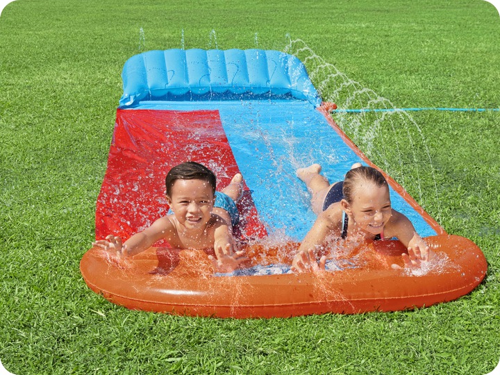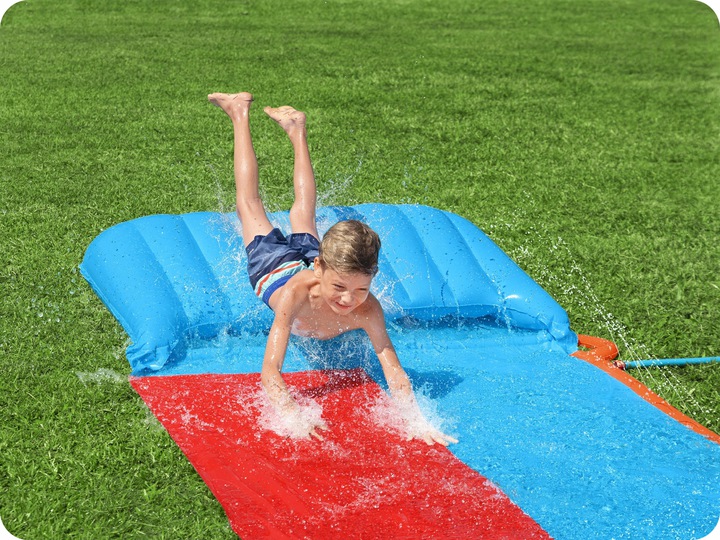 Водна гірка двомісна Bestway 52478 — це двосмугова надувна гірка довжиною 488 см, яка подарує дітям справжні літні пригоди. Вона легко підключається до садового шланга, має вбудовані розбризкувачі води та м’яку надувну фінішну зону для безпечного приземлення. Завдяки двом доріжкам діти можуть влаштовувати веселі змагання, спускаючись одночасно, а постійне зволоження поверхні робить ковзання швидким і захопливим.