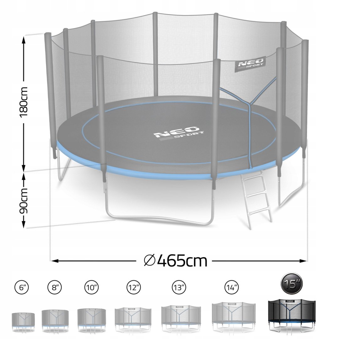 Батут Neo-Sport NS-15Z221 з зовнішньою сіткою 15 футів 465 см – це просторий садовий батут, створений для активного відпочинку та розваг на свіжому повітрі. Завдяки великій площі для стрибків він підходить як для дітей, так і для дорослих. Конструкція вирізняється міцністю та стабільністю, витримує навантаження до 150 кг і забезпечує високий рівень безпеки завдяки зовнішній захисній сітці, міцному каркасу та продуманим деталям.