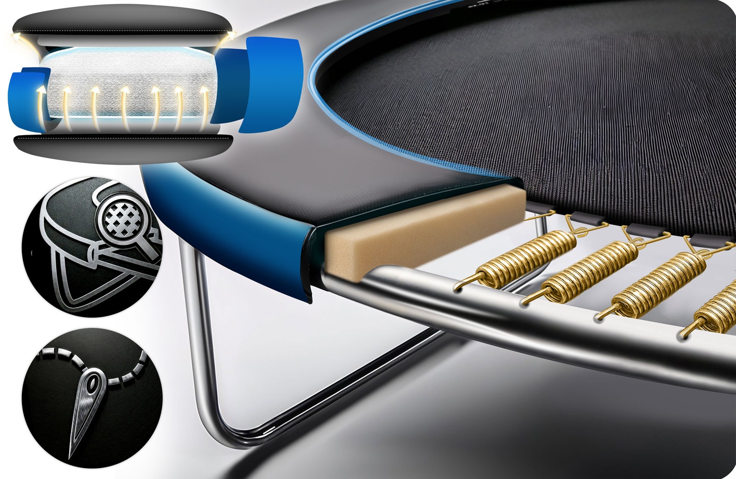 Подовжені пружини з підвищеною еластичністю забезпечують плавний і динамічний відскок без ривків. Високоякісний килимок для стрибків гнучкий, пружний, повітропроникний і стійкий до зовнішніх умов, що гарантує комфорт у будь-яку погоду.