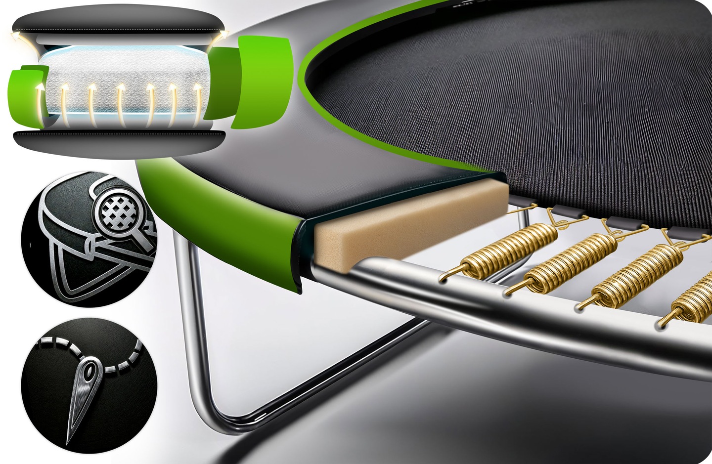 Подовжені пружини з підвищеною еластичністю забезпечують плавний і динамічний відскок без ривків. Високоякісний килимок для стрибків гнучкий, пружний, повітропроникний і стійкий до зовнішніх умов, що гарантує комфорт у будь-яку погоду.