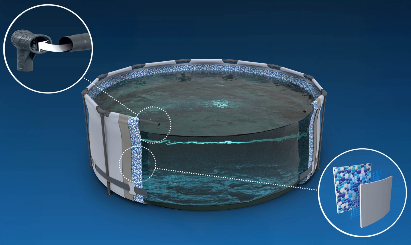 Басейн виготовлений із 3‑шарового матеріалу PVC Tritech, посиленого нейлоновою сіткою між шарами. Це забезпечує стійкість до проколів і механічних пошкоджень. Внутрішнє дно прикрашене мозаїчним візерунком у біло‑синій гамі, що додає естетики та створює приємну атмосферу для купання. Це матеріали, які гарантують довговічність та надійність.