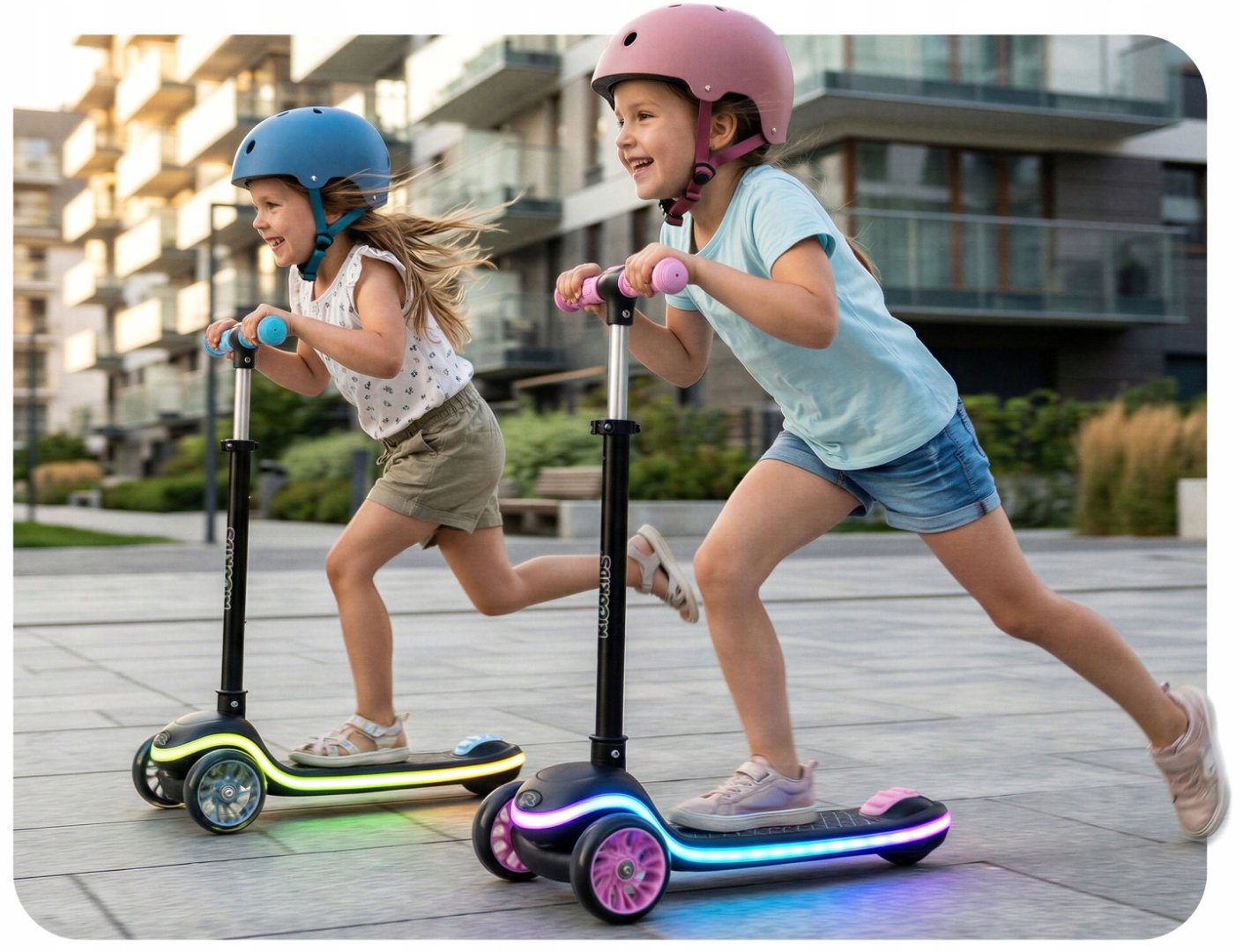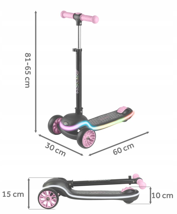 Легка вага та система швидкого складання роблять його практичним для щоденного використання вдома чи на вулиці. Конструкція враховує потреби дитини, поєднуючи комфорт, безпеку та сучасний дизайн із LED‑підсвіткою, яка додає катанню видовищності.