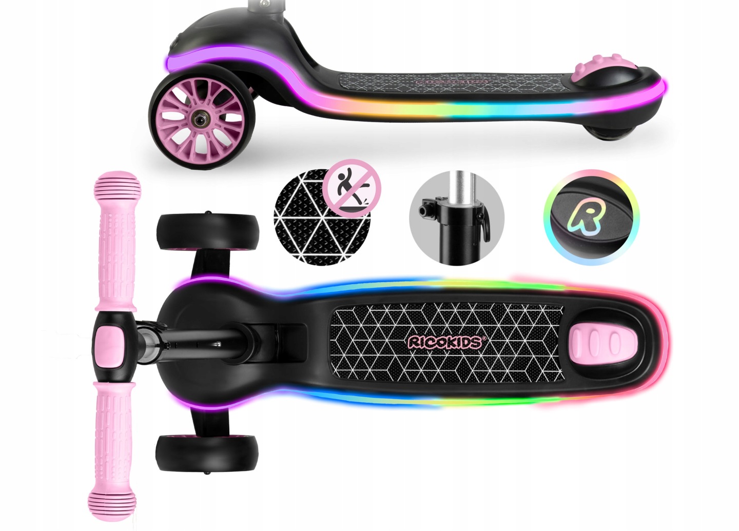 Дитячий самокат триколісний Ricokids Leddi чорно-рожевий